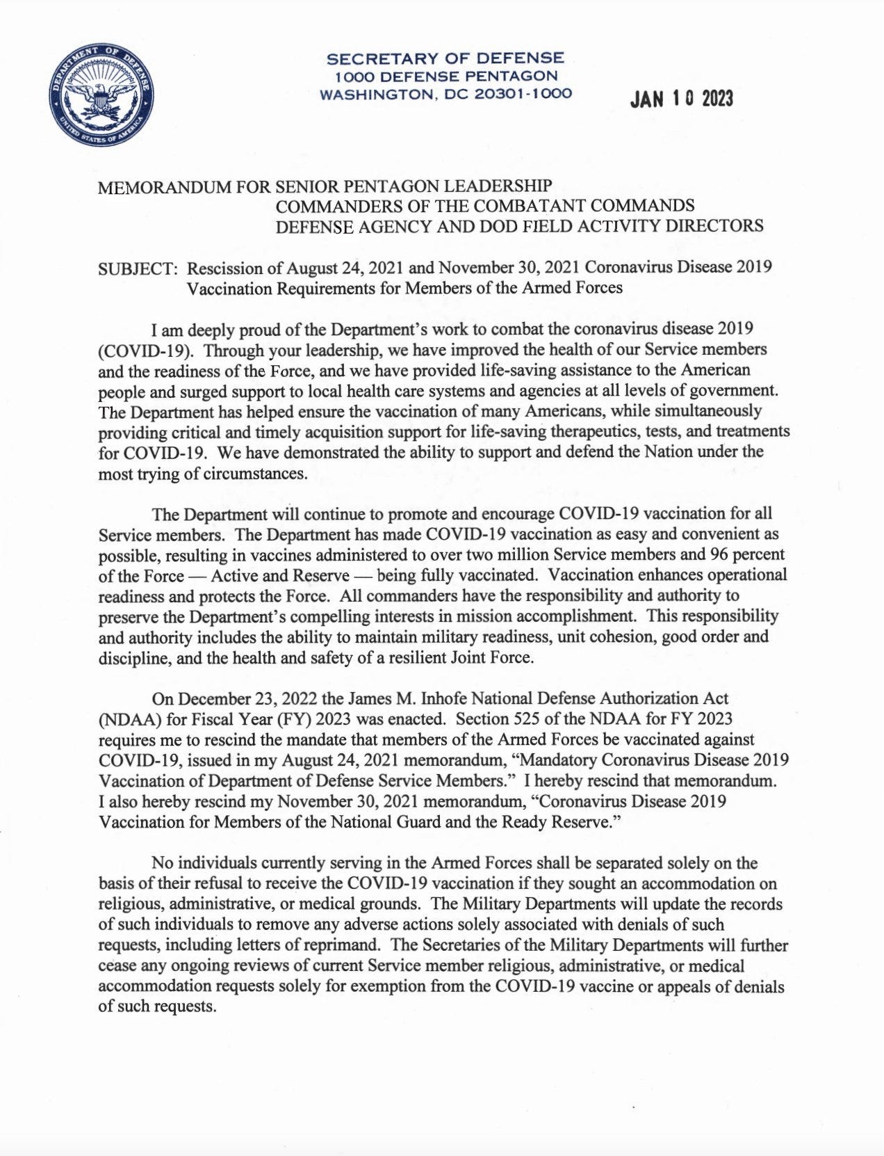The DEATHVAX™ that never prevented transmission nor attenuated symptoms along with the ineffectual social distancing and masking in no way improved the health of Service members, so the below is just more propaganda and whitewashing ahead of the reversal of unconstitutional policy.