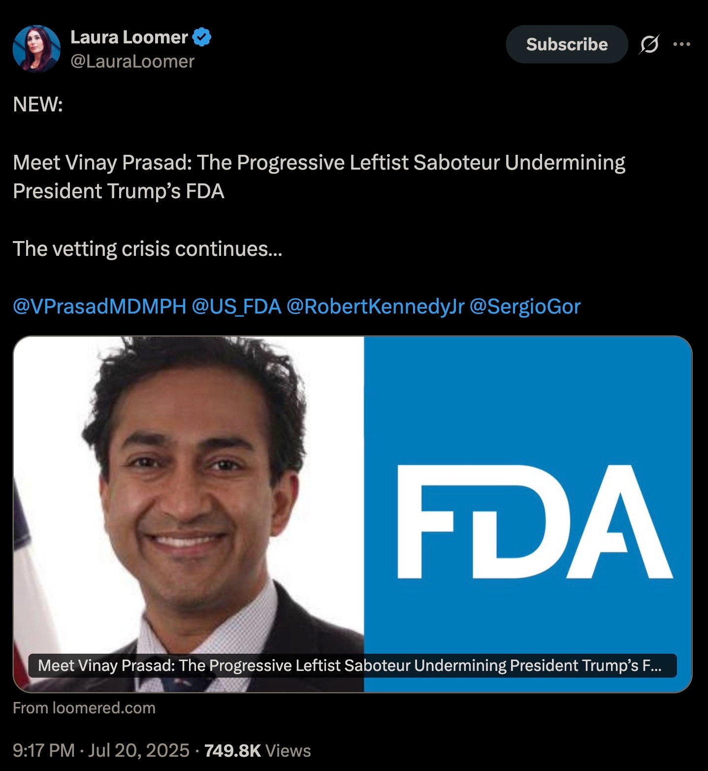 We have a crisis at the FDA! A wolf in sheep’s clothing is sabotaging President Trump’s bold “Make America Healthy Again” (MAHA) agenda! Dr. Vinay Prasad @VPrasadMDMPH, a self-proclaimed progressive liberal and Bernie Sanders fanboy, has wormed his way into a top FDA role as Director of the Center for Biologics Evaluation and Research (CBER) after he was appointed by RFK Jr @RobertKennedyJr.