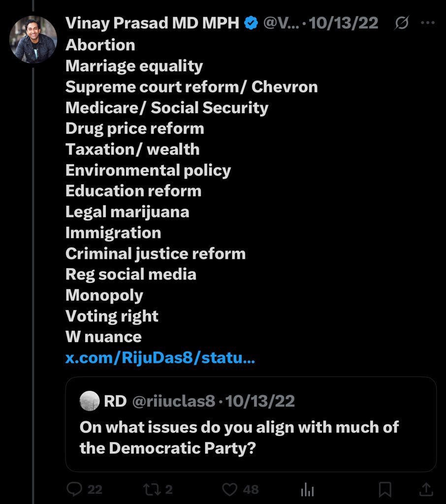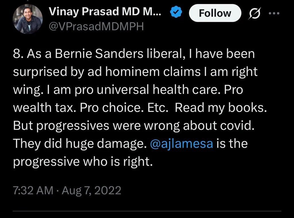 Vinay Prasad isn’t just a liberal… he’s a card-carrying member of the Elizabeth Warren/Bernie Sanders fan club, proudly waving the progressive flag. His own words betray him: