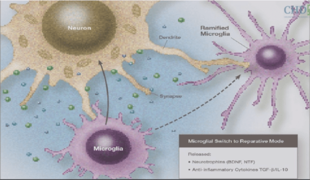When you get an infection and recover from it, microglia shift from the activated state back to the ramified state. In the ramified state, instead of releasing harmful chemicals the microglia release neurotrophins that repair the damage done during the activated state.
