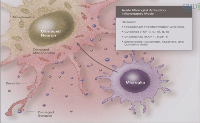 When there’s systemic inflammation or any kind of trauma occurs in the body, it produces inflammation and activation of the immune system. This sends a signal to the brain within minutes and starts activating the microglia which is the inflammatory, cytotoxic cell in the brain.