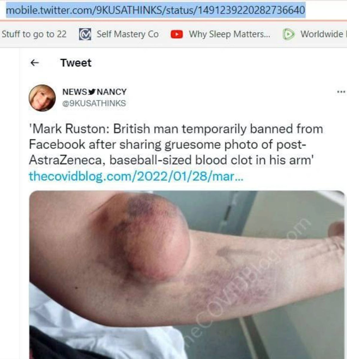 British Man Temporarily Banned from Facebook After Sharing Gruesome Photo of Post-AstraZeneca DEATHVAX™ of Baseball-Sized BLOOD CLOT in His Arm2nd Smartest Guy in the WorldFeb 12, 2022279ShareMy first thought was, “who the hell still uses Facebook?”My second thought was, “unsurprising.” My third thought was to share with you my subscribers:Comply and YOU Die.