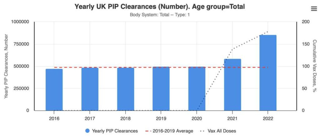 Phinance Technologies, a company specialising in independent data mining and consultation, has published an analysis of UK disability claims over the last seven years (https://phinancetechnologies.com/HumanityProjects/PIP Analysis-Systems.htm). The total number of new claims for Personal Independence Payments (PIPs) for all ages and all causes made by people claiming disability is graphed as follows:
