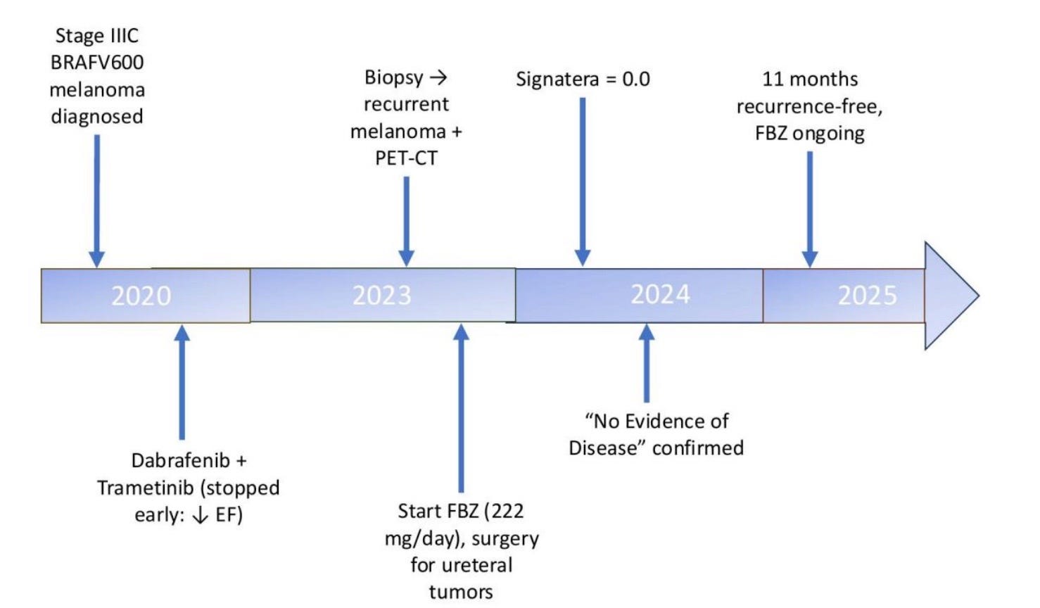 On December 12, 2023, however, a biopsy confirmed recurrence: a 1.6 mm ulcerated malignant melanoma located in the lower left abdomen (SOX-10 and pan-melanoma positive). PET-CT showed multiple hypermetabolic foci—peritoneal and retroperitoneal nodules, focal uptake in the stomach and small bowel, lesions in the right gluteus medius, quadratus femoris, and L5 vertebra. Incidental finding included mass-like distal ureter thickening which was confirmed on biopsy to be a different malignancy (urothelial carcinoma). Tempus xF (circulating tumor DNA) showed presence of BRAFV600 mutation, suggestive of the presence of recurrent melanoma. The patient’s oncologist recommended delaying immunotherapy with nivolumab (Opdivo) after biopsy of the recurrent melanoma. During this treatment-free window, he began self-administering FBZ daily (dose range: 222mg – 444mg) in mid-December 2023. The ureteral tumors disrupted urination, necessitating surgery in mid-December 2023. Blood tumor markers, measured as circulating tumor DNA, provided clear evidence of the melanoma progression and subsequent remission. On November 29, 2023, before initiating FBZ, the tumor marker with Signatera test was 123.37. By January 17, 2024, less than seven weeks after starting the treatment, it dropped to 0.38 and reached 0 (zero) by February 21, 2024. During this period, the patient received two doses of nivolumab. Remarkably, at the February 2024 follow-up, imaging and blood tests indicated “no evidence of disease” (NED). Supplements—including ascorbic acid (2,000 mg BID), cephalexin (500 mg single dose), cholecalciferol, CoQ10, cyanocobalamin, and glutathione—were taken throughout treatment and were part of the patient’s regular routine before and after remission. The patient remains melanoma recurrence-free over eleven months after being declared to be in remission. A summary timeline is provided in Figure 3 below.