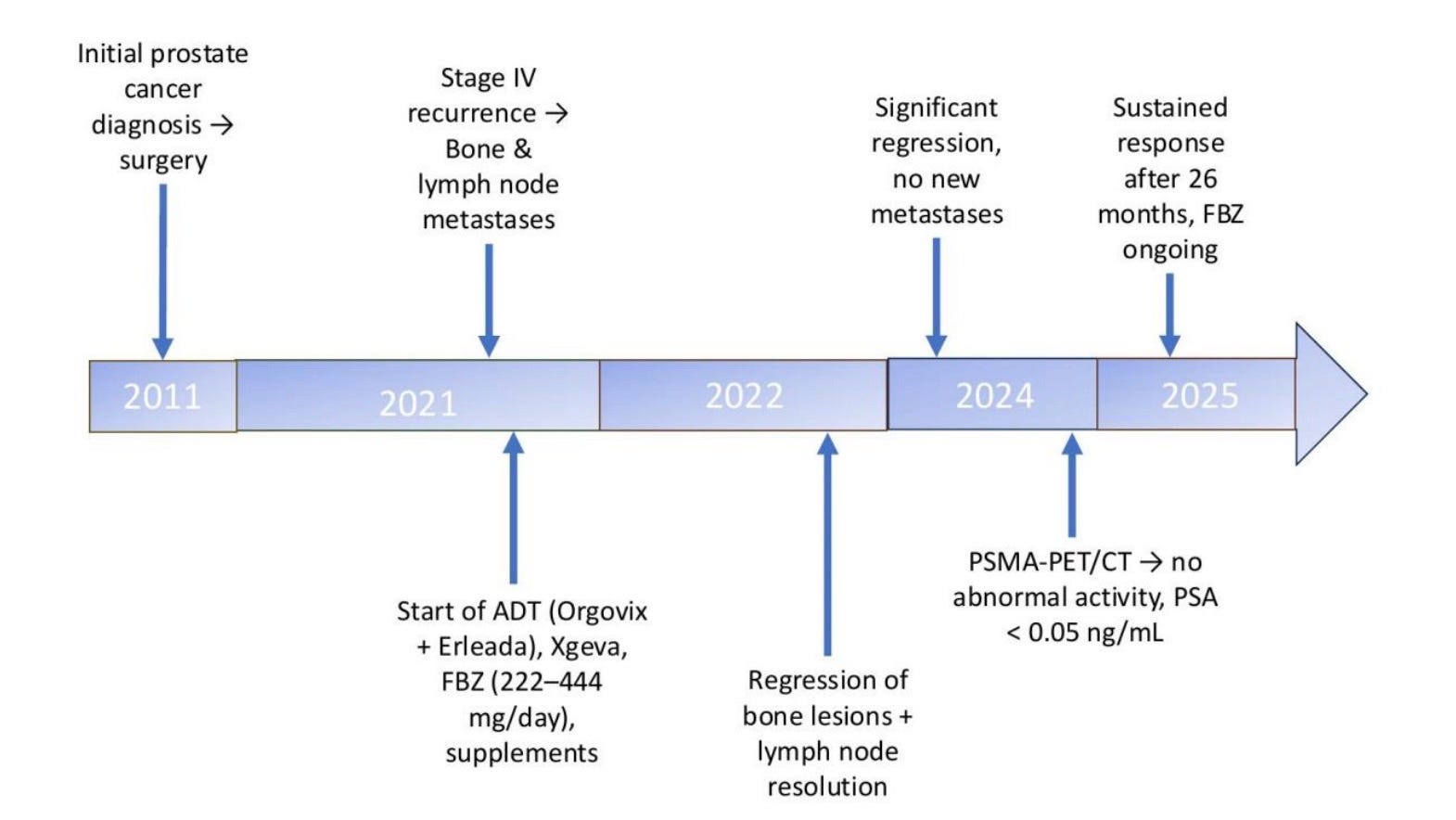 A 75-year-old man was diagnosed in December 2021 with recurrent stage IV prostate cancer and extensive bone metastases. Initially diagnosed ten years earlier and treated surgically, he had undetectable PSA levels for 18 months before a gradual rise indicated recurrence of prostate cancer.. The diagnosis of metastatic cancer was confirmed through imaging studies and elevated PSA levels. Bone scans and CT scans revealed metastases in the spine, pelvic bones, and right humeral head, along with significant lymph node involvement. On a CT abdomen/pelvis with and without IV contrast performed on December 16, 2021, prominent left periaortic lymph nodes were identified, with a representative lymph node measuring 0.8 cm, which was not seen in previous studies. In December 2021, the patient initiated androgen deprivation therapy (ADT) with Orgovix and Erleada, complemented by Xgeva to support bone health. He also added repurposed medications and supplements: vitamin D (5,000–10,000 IU/day) with K2 and magnesium, melatonin (10–40 mg/day), berberine, curcumin, artemisinin, cimetidine, and other compounds with potential anticancer effects. He started taking FBZ in December 2021 (dose range: 222–444 mg/day), usually daily, with occasional dose reductions. In December 2022, after one year of follow-up, regression of bone lesions was observed, and lymph node involvement had fully resolved. In January 2024, after two years of follow-up, imaging confirmed significant regression of bone lesions with no new metastatic sites. The use of FBZ coincided with continued regression of metastatic lesions and sustained undetectable PSA levels. No increase in liver enzymes or any other side effects attributable to FBZ were reported. In April 2024, a PSMA-PET/CT whole body scan revealed that the vast majority of the sclerotic bone lesions demonstrated no abnormal radiopharmaceutical accumulation. A large left renal cortical cyst deforming the kidney had a SUV of 0.5, and no abnormal radiopharmaceutical accumulation was observed within lymph nodes. PSA levels remained undetectable for over two years (<0.05 ng/mL). After 26 months of sustained regression and no new progression, the patient remains in near complete response and continues FBZ with conventional therapy (ADT with Xgeva) . A summary timeline is provided in Figure 2 below.
