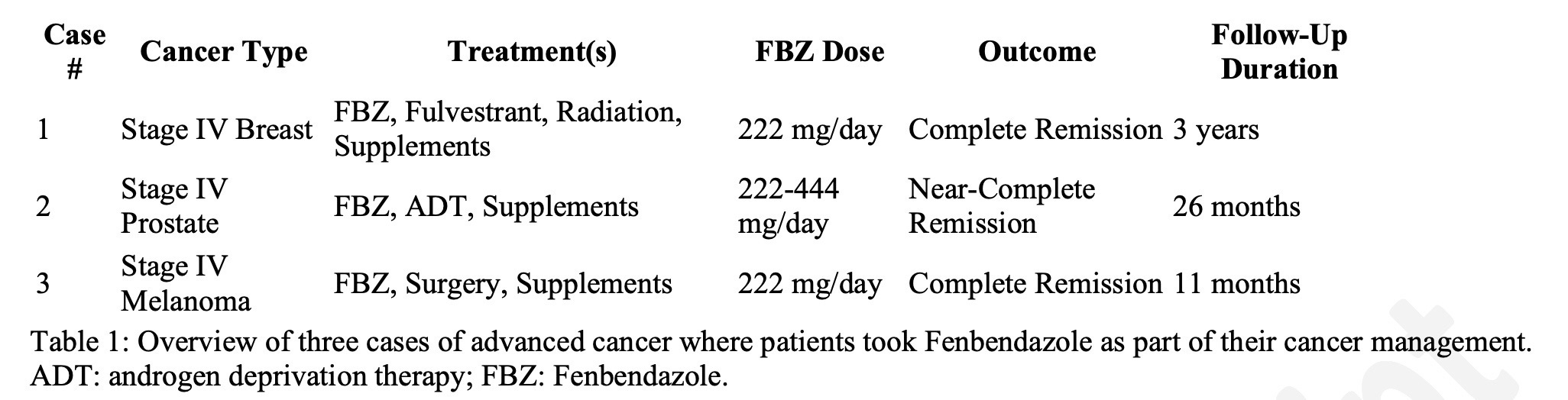 Keywords: Fenbendazole; Veterinary medication; Anti-parasitic; Case report; Repurposed drug, Benzimidazoles; Advanced cancer; Cancer regression.