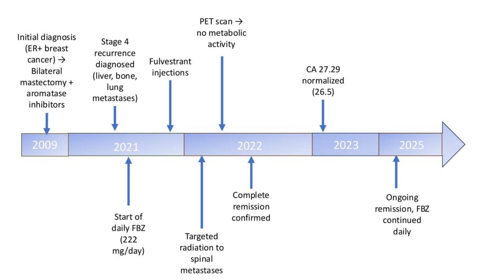An 83-year-old female was diagnosed with stage 4 breast cancer in October 2021. She was initially diagnosed in 2009 with estrogen receptor-positive breast cancer, treated with bilateral mastectomy, reconstruction, and aromatase inhibitors (later discontinued). She remained disease-free until a recurrence was diagnosed in 2021. Immunohistochemistry revealed strongly positive for CK7 (Cytokeratin 7), Cytokeratin Oscar, GATA3 (GATA Binding Protein 3), and CD68 (Cluster of Differentiation 68). The patient underwent an Esophagogastroduodenoscopy with Endoscopic Retrograde Cholangiopancreatography (ERCP) due to biliary obstruction requiring stent placement. During that procedure, she underwent a Fine Needle Aspiration (FNA) of her liver, which confirmed metastatic breast carcinoma characterized as ER/PR positive and HER-2/neu negative. Ascitic fluid analysis also confirmed metastatic breast carcinoma. Magnetic Resonance Imaging (MRI) of the spine in October 2021 revealed metastatic breast cancer involving multiple bones, including T10, T12, L1, L2, L3, L4, L5, S1, S2, and the iliac bones. A PET/CT scan on December 29, 2021, showed six hypermetabolic lung lesions, the largest located in the central right upper lobe measuring 2.8 × 1.5 cm (SUV max 8.4), a posteromedial right lower lobe lesion measuring 1.8 × 1.4 cm (SUV max 4.6), and a left upper lobe lesion measuring 0.8 cm (SUV max 4.4). There were hypermetabolic liver lesions in the left hepatic lobe, with the index lesion in the medial left hepatic lobe measuring 2.9 × 1.7 cm (SUV max 5.6) and hypermetabolic bone lesions, notably a 5.0 × 2.9 cm lytic lesion in L4 (SUV max 6.8) extending into the spinal canal, and a 2.0 cm lesion in T12 (SUV max 3.5). The patient declined further conventional chemotherapy or radiation therapy and was placed under hospice care. On November 22, 2021, she began self-administering FBZ daily at a dose of 222 mg. In December 2021, she received fulvestrant injections (an estrogen receptor blocker) intended to inhibit cancer growth in a manner similar to restricting glucose. In January 2022, she underwent targeted radiation for two painful spinal metastases. These tumors disappeared rapidly, relieving her pain within a few days. She continued taking 222 mg/day of FBZ for eight months. During this time, her liver enzymes normalized, and her CA 27.29 dropped from 316 (November 2021) to 36.6 (July 2022) (see supplementary material). On April 20, 2022, a PET scan confirmed the absence of any abnormal metabolic activity indicative of cancer. This was corroborated by the steady decline in her CA 27.29 levels, which can lag cancer elimination by several months. In June 2022, the patient was confirmed to have no evidence of active disease. All treatments were discontinued, and she was considered to be in complete remission. Follow-up monitoring was scheduled every 3 to 6 months. Throughout her FBZ treatment, she continued her regular supplementation of vitamin D (5000 IU) and a multivitamin. In July 2022, blood tests revealed elevated Alanine Aminotransferase (ALT) and Aspartate Aminotransferase (AST) levels, suggesting potential liver dysfunction, though it remains unclear whether this was caused by fulvestrant, FBZ, or an interaction between the two. Liver function normalized within weeks, while CA 27.29 levels continued to decline to 37 (July 2022) and 26.5 (February 2023), both values within the normal range. Subsequent PET scans showed no abnormal metabolic activity. The FBZ treatment period revealed no adverse effects at this dosage. The patient remains recurrence-free and continues to take FBZ daily nearly three years after being declared to be in remission. A summary timeline is provided in Figure 1 below.