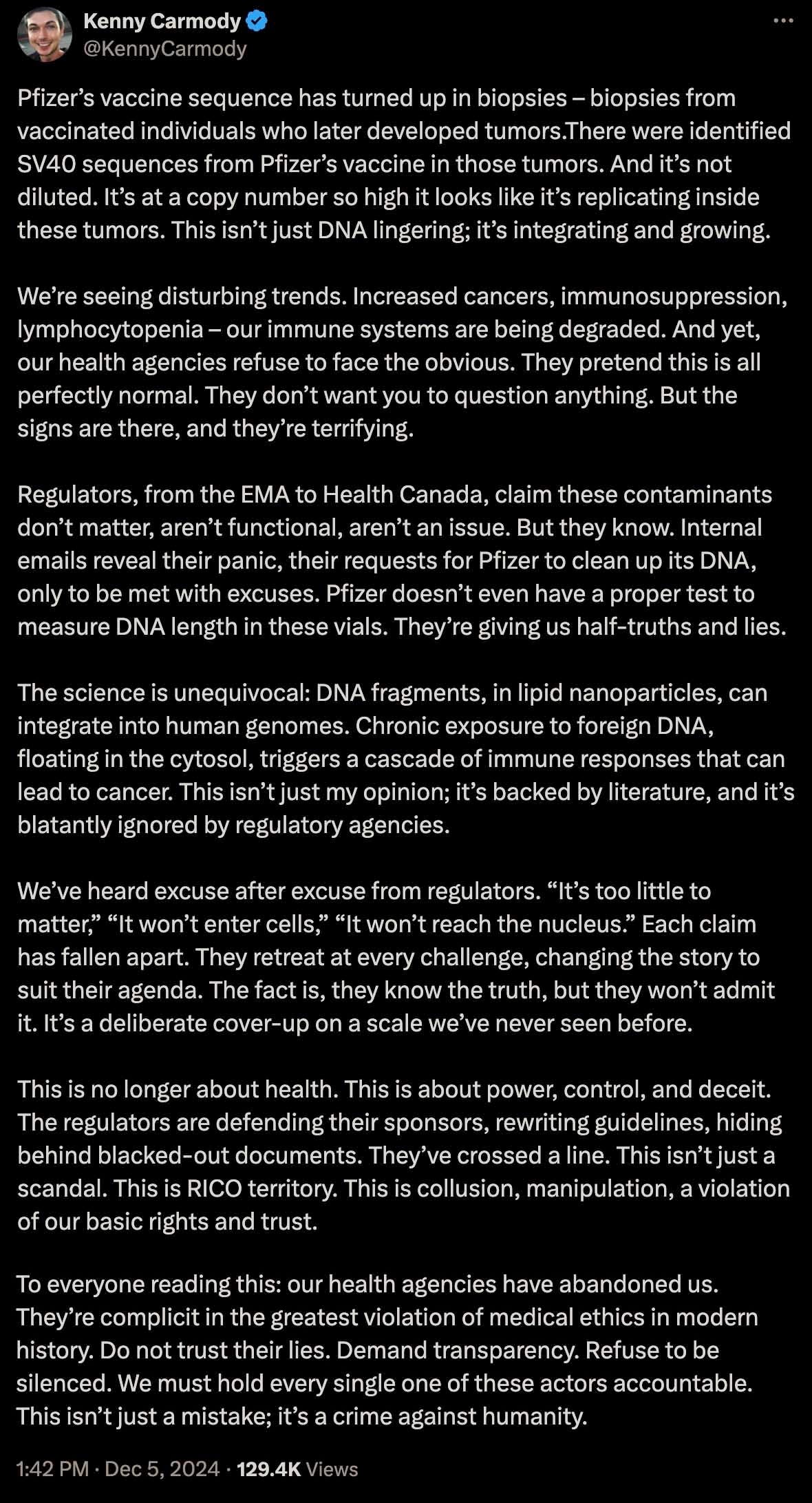 The SV40 promoter contamination and spike protein revelations demand a full investigation and legal action against those responsible. This is not just a public health issue; it’s a matter of justice for the countless lives harmed or lost.