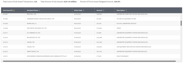 A closer examination of the contract’s “Sub-Awards” tab reveals 115 transactions with recipients and brief descriptions, the majority of which are mundane items like “laboratory equipment for Kyiv” and “office furniture for Kyiv.”
