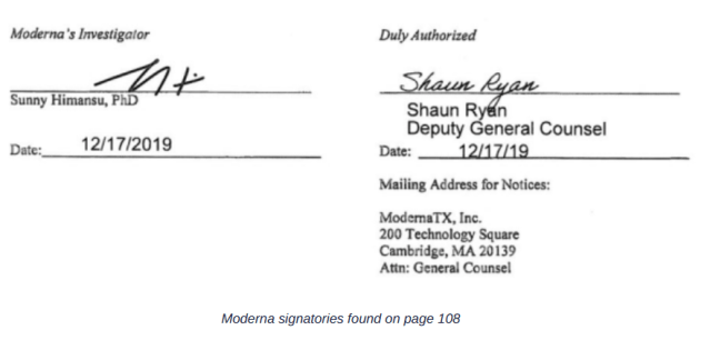 The final signatories on the agreement were Sunny Himansu, Moderna’s Investigator, and Shaun Ryan, Moderna’s Deputy General Counsel. Both signatures were made on December 17th 2019.