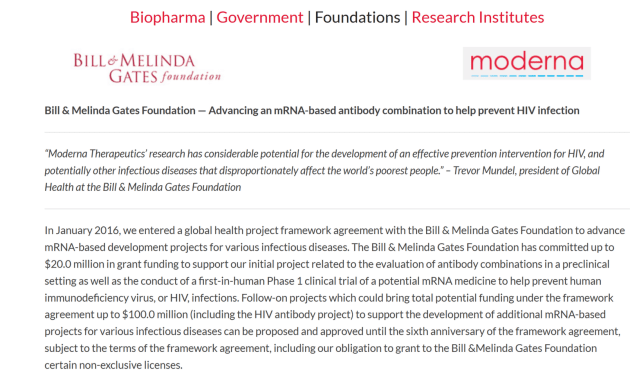 Moderna confirmed in 2016 that the Bill & Melinda Gates Foundation had granted them $20 million to support their “initial project related to the evaluation of antibody combinations in a preclinical setting as well as the conduct of a first-in-human Phase 1 clinical trial of a potential mRNA medicine”.