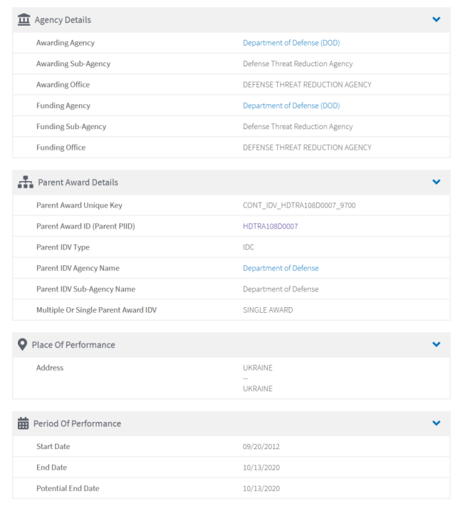 The contract was for a Biological threat reduction program in Ukraine, and concluded in October 2020. While the details are unclear, it is known that $21.7 million of the $116.6 million contract was spent on this program.