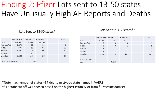 The original investigation of VAERS data also found that specific batches of the Pfizer and Moderna Covid-19 vaccines which were distributed to between 13 and 50 states across the USA had an unusually high number of adverse event reports and deaths compared to lots that were distributed to 12 states or less across the USA