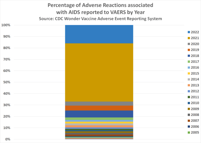 The following chart shows the percentage of all of the above AIDS-associated adverse reactions reported to VAERS to all vaccines by year –
