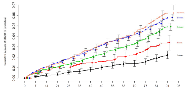 The results of their study, shown graphically above, demonstrate that the more doses of the original vaccine you took, the more likely you were to catch covid. In other words, the original Covid vaccine is not merely ineffective against Omicron. It is actually anti-effective.