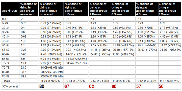 So taking 2021 as the base line, a 5 dosed person would be 350% more likely to die in 2031 and 700% more likely to die in 2041 and 1050% more likely to die in 2051 than an unvaxxed person. It is just like compound interest.
