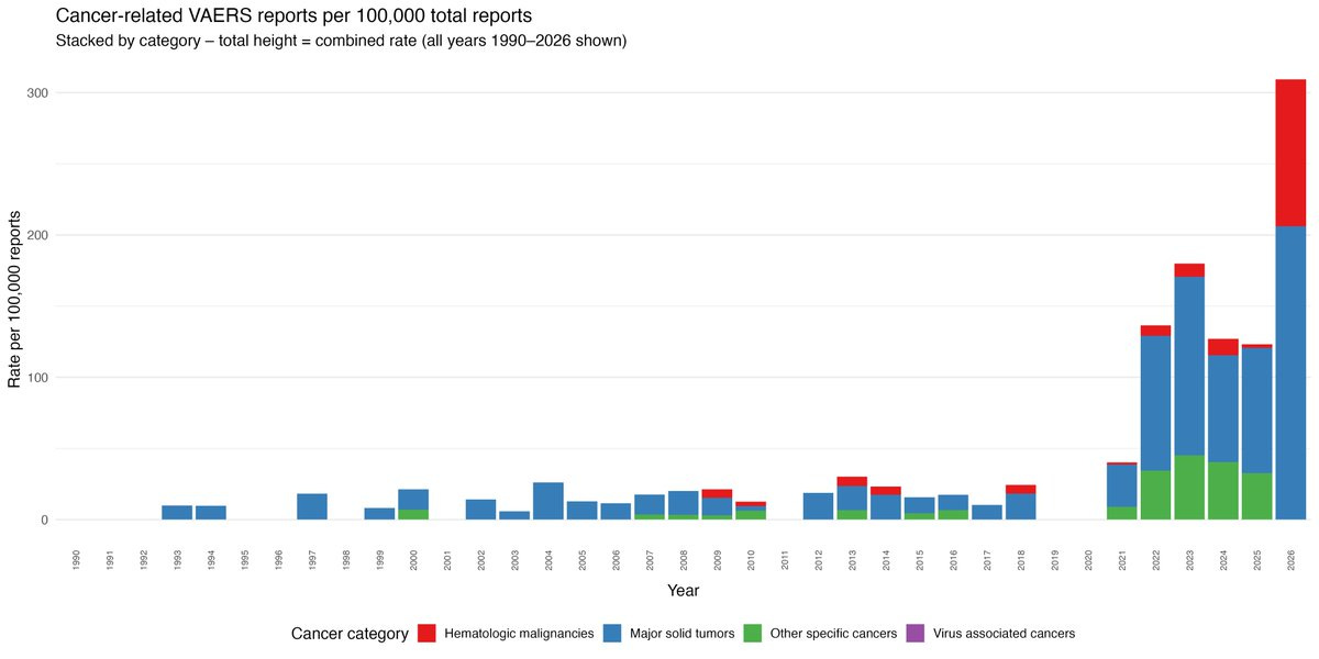 Except that to call cancer rates ‘skyrocketing’ is actually anything but hyperbolic, and thanks to recent VAERS data we have irrefutable proof that this turbo cancer phenomenon has in fact exploded: