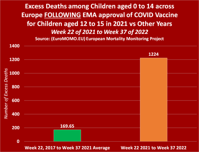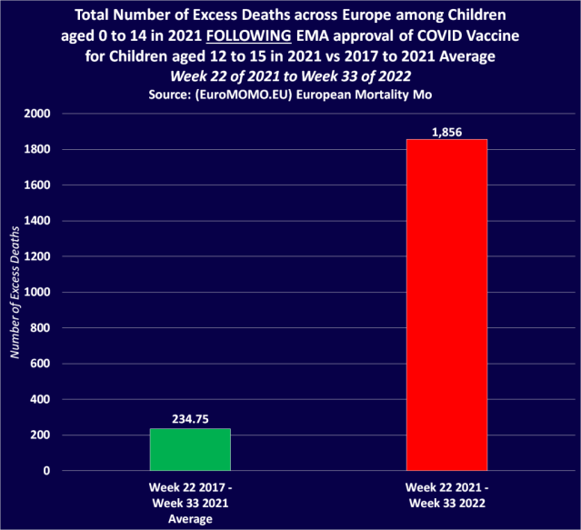 Once we combine the figures for week 22 in 2021 onwards up to week 33 of 2022 , and compare them against the combined 2017 to 2020 & 2018 to 2021 average, we find that excess deaths among children across Europe had increased by 691% since the European Medicines Agency first approved a Covid-19 vaccine for children aged 12 to 15 in May 2021.