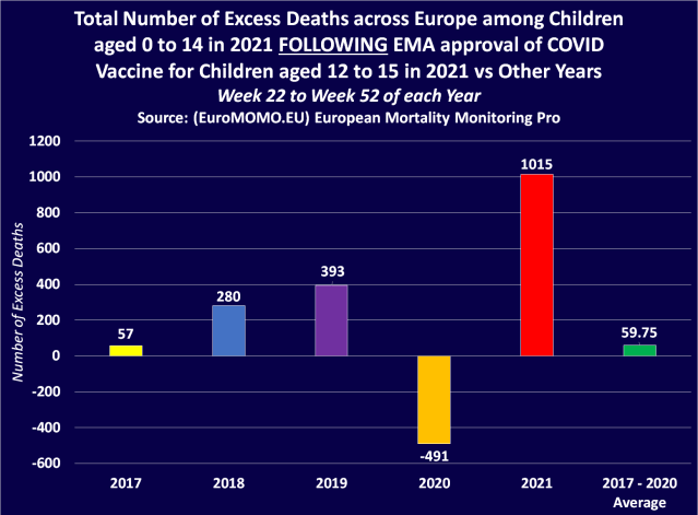 The 2017 to 2020 average number of excess deaths among children across Europe between week 22 and week 52 equates to 59.75. But during the same period in 2021, following EMA approval of the Pfizer Covid-19 vaccine for children, there were 1,015 more deaths among children than expected and 955.25 more deaths than the 2017 to 2020 average.