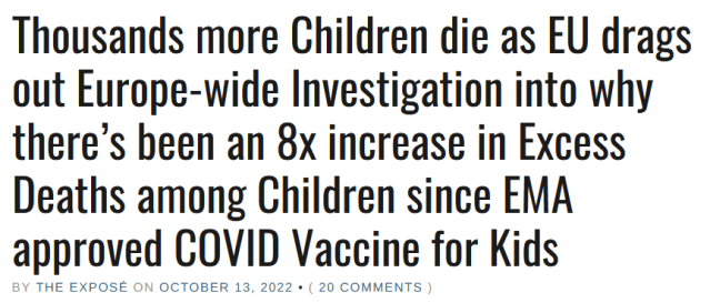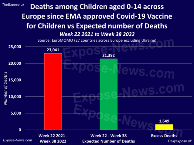 That’s because, as previously revealed in an exclusive investigation by The Expose, official figures show that by August 29th 2022, Europe had recorded a 691% increase in excess deaths among children aged 0-14 ever since the European Medicines Agency extended the emergency use authorisation of the Pfizer Covid-19 vaccine for use in children aged 12 to 15 in May 2021.