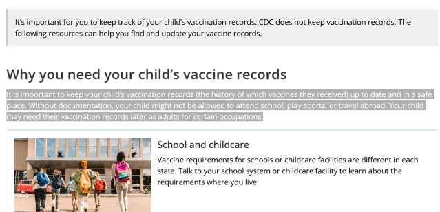 “It is important to keep your child’s vaccination records (the history of which vaccines they received) up to date and in a safe place. Without documentation, your child might not be allowed to attend school, play sports, or travel abroad. Your child may need their vaccination records later as adults for certain occupations.
