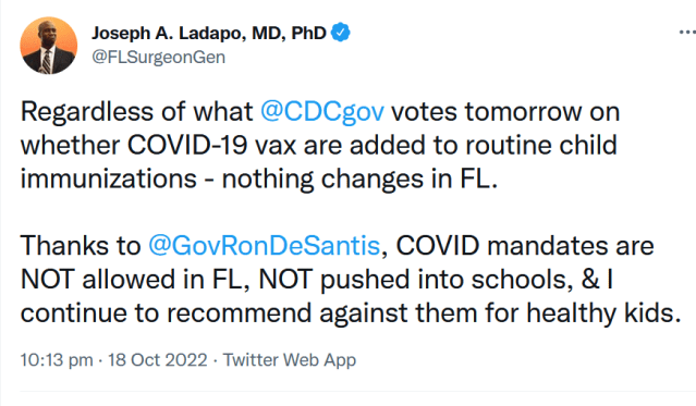 Florida Surgeon General, Dr. Joseph Ladapo, has sought to reassure residents of Florida by writing on Twitter that “regardless of what @CDCgov votes tomorrow on whether COVID-19 vax are added to routine child immunizations – nothing changes in FL.”