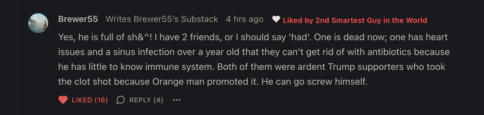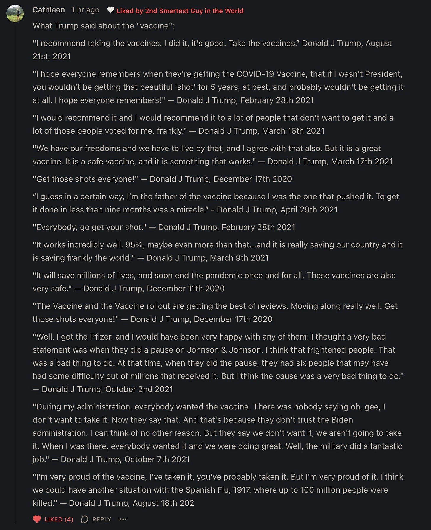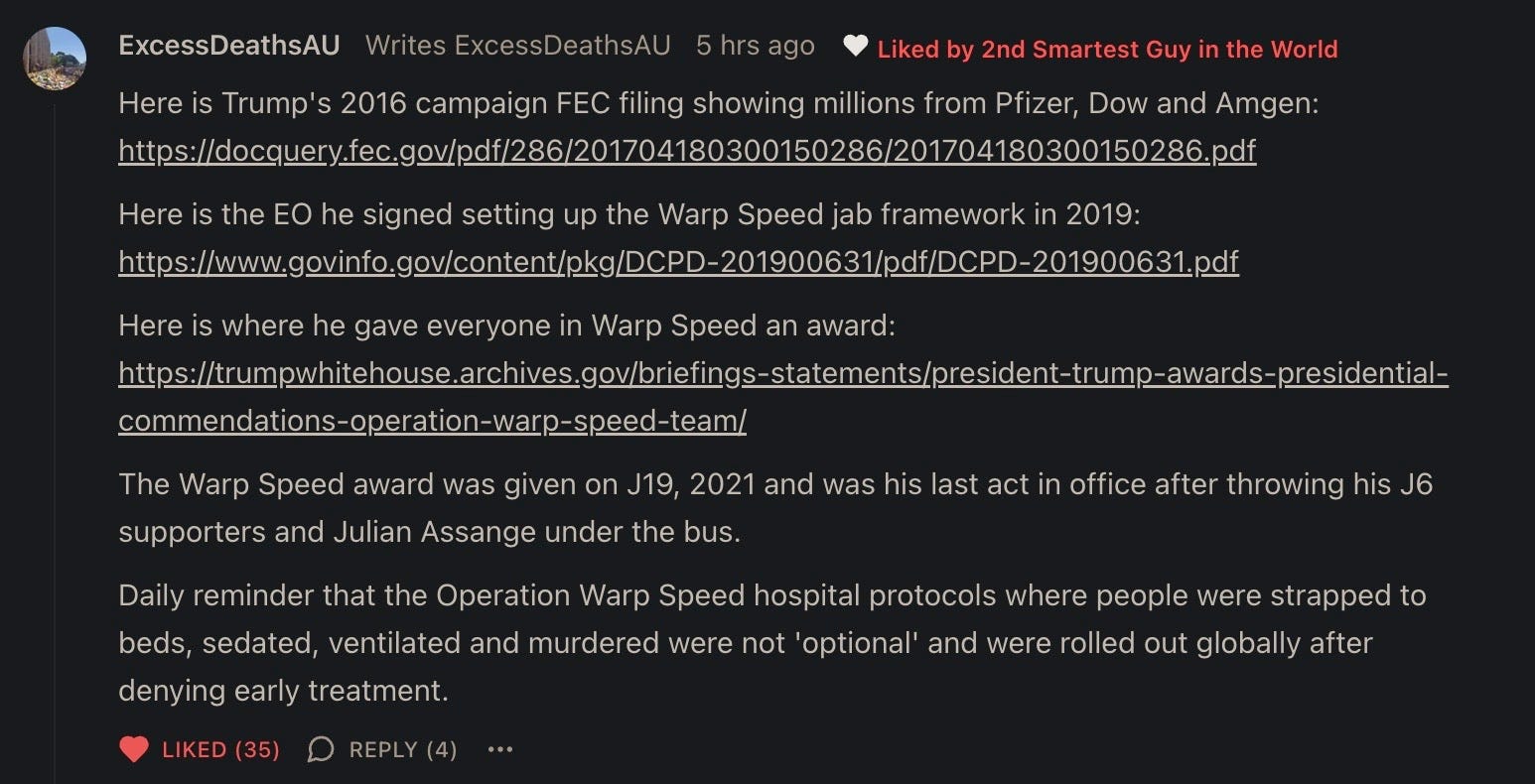The biggest takeaway from the comments section was why Trump has refused to admit that his “beautiful” DEATHVAX™ was the single most disastrous democidal program in the history of mankind?