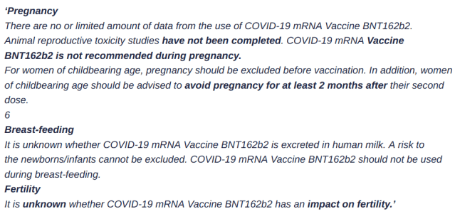 So with this being the case, how on earth have medicine regulators around the world managed to state in their official guidance that “Animal studies do not indicate direct or indirect harmful effects with respect to pregnancy”? And how have they managed to state “It is unknown whether the Pfizer vaccine has an impact on fertility“?
