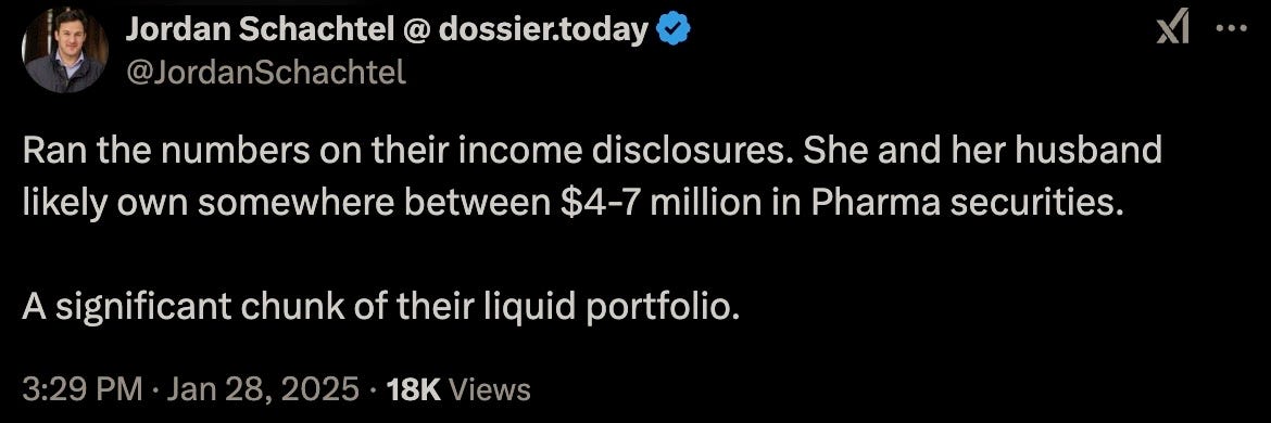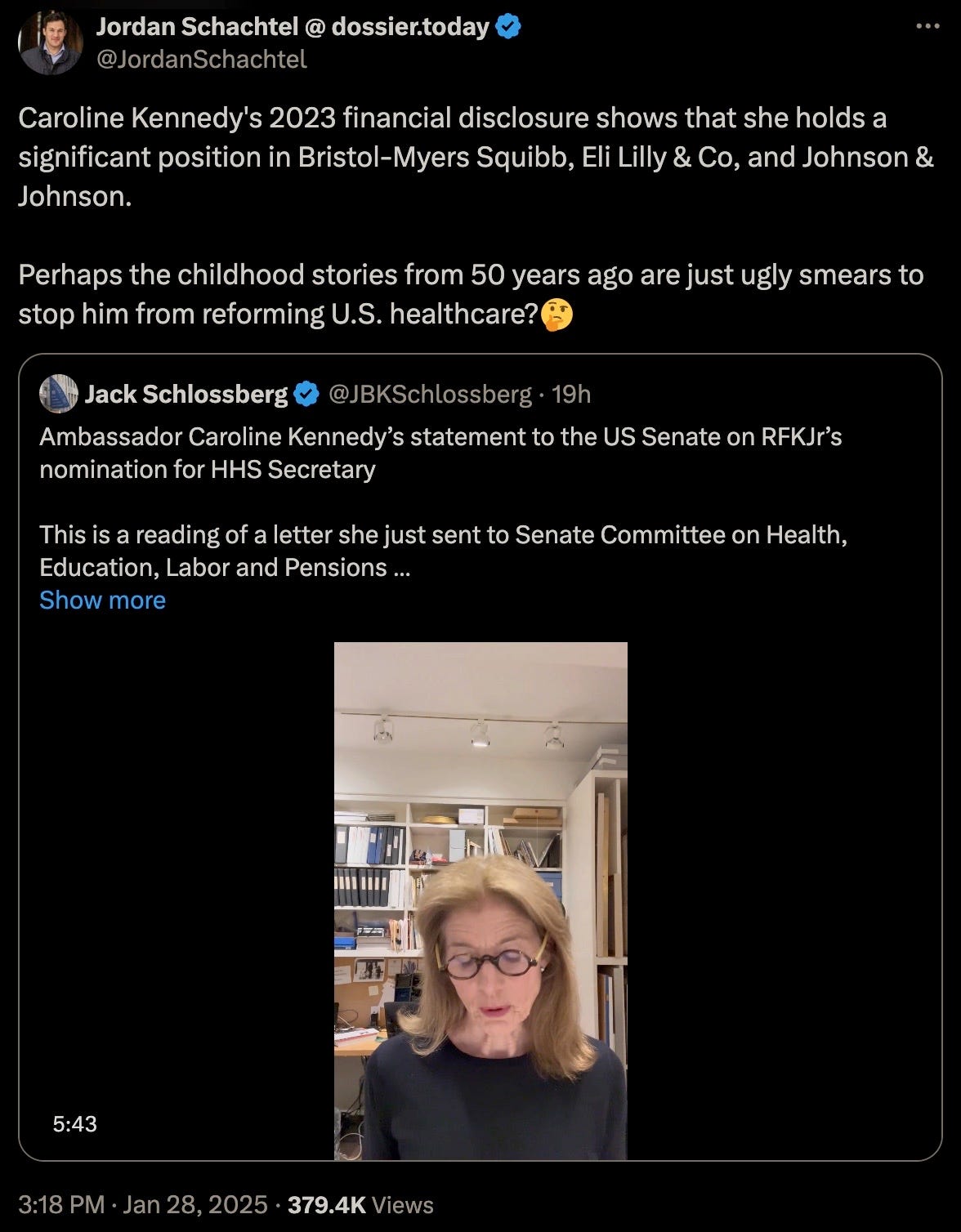 Knowing the fact that Caroline is invested in these drug companies should be a top consideration then. It was also trending on "X" that Bill Gates is behind a mass petition of fake Doctors who are urging those who would confirm RFK to vote no. You would think the fact that her family has experienced many losses of life would make her open her mind up to the powers that should not be but it's always profits over people.