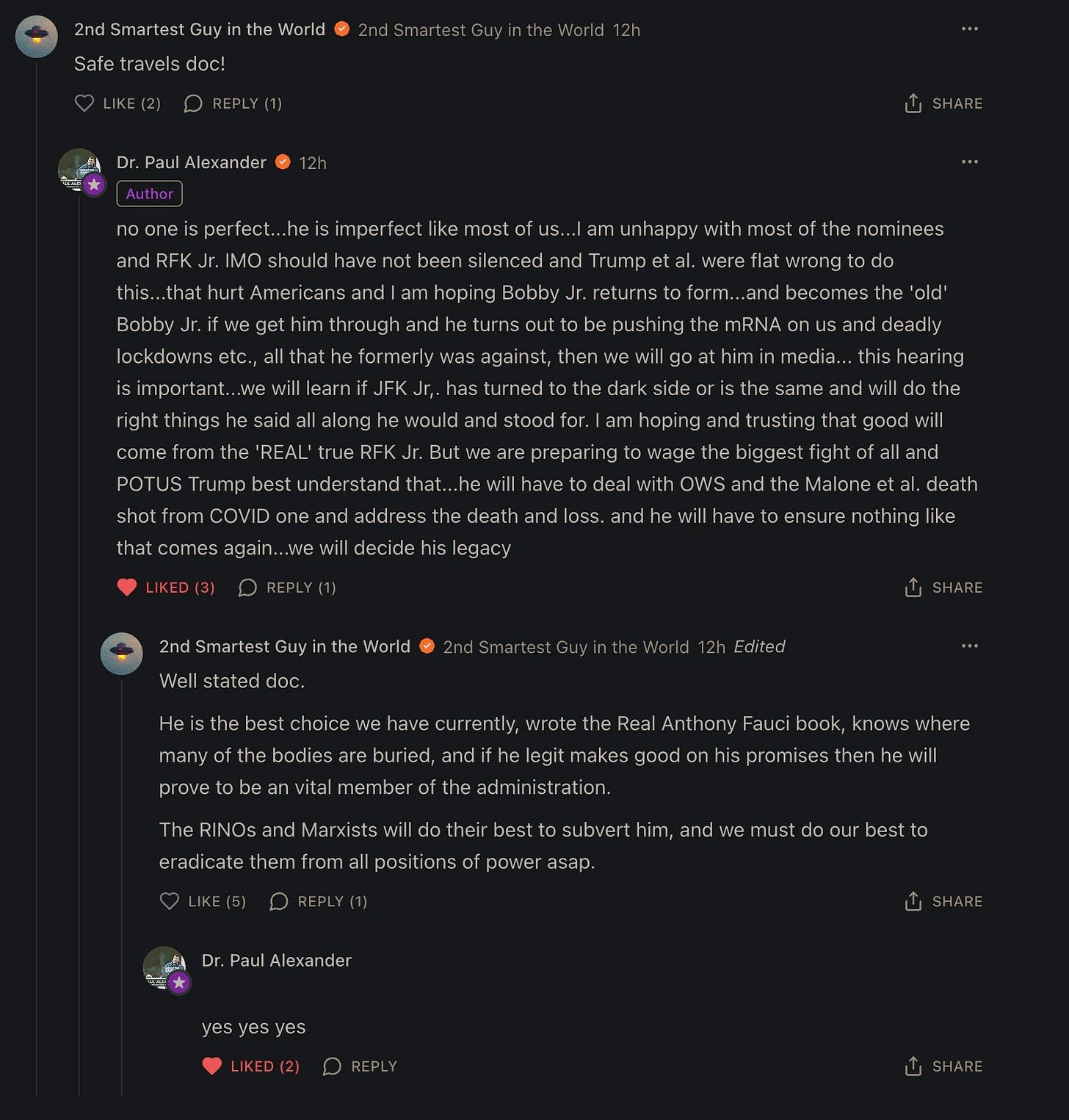 Yours truly had an exchange last night with a true hero in the Medical Freedom Movement in Dr. Paul Alexander, who just travelled to Washington, D.C. to throw his support behind RKF Jr.; and while no candidate is perfect, RFK Jr. at this point in time represents our only chance to bring the entire Medical Industrial Complex to heel: