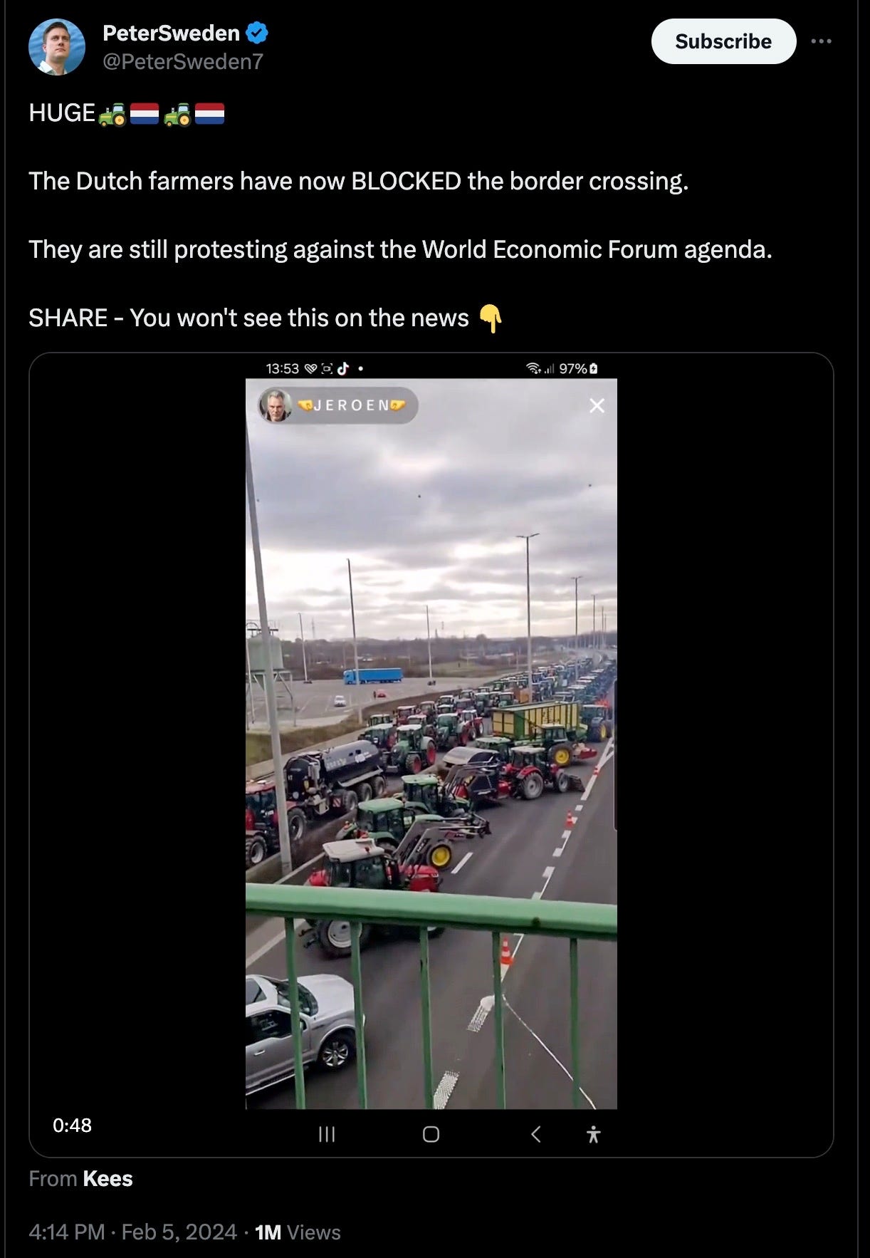 And history certainly rhymes hard yet again, as today the farmers of Europe have come together to protest these murderous globalist policies to radically reduce populations via starvation (because the slow kill bioweapon “vaccines” are taking too long for them to wipe out large enough swaths of humanity in time for their 2030 Agenda deadline).