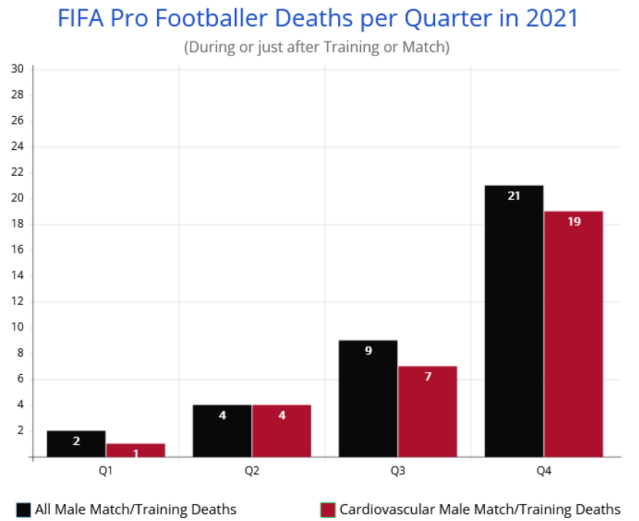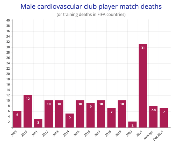 Deaths of professional football / soccer players due to cardiovascular issues such as cardiac arrest and heart attack are doubling every three months, with the number of deaths occurring in December 2021 alone equalling the annual average over the previous 12 years.