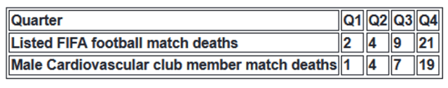 The data shows that professional football/soccer players died of cardiovascular problems during games (match or training) at 4 times the average rate recorded between 2009 and 2020.