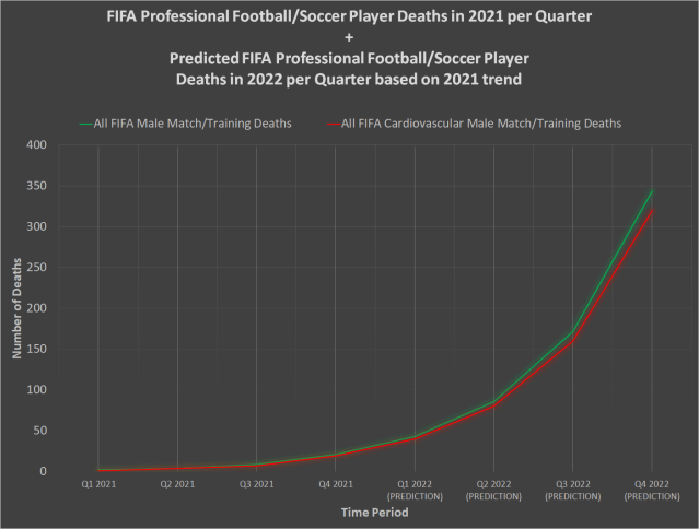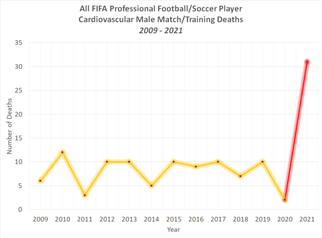 So with deaths of professional football / soccer players due to cardiac arrest and heart attack doubling every three months, and the number of deaths occurring in December 2021 alone equalling the annual average over the previous 12 years, at the same time as a mass vaccination campaign known to cause a tremendous amount of cardiovascular disorders, it isn’t hard to conclude that the Covid-19 vaccines are most likely to blame for deaths among professional football/soccer players in 2021 being 4 times the average rate recorded between 2009 and 2020.