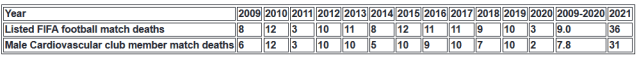 The following table shows the total number of listed Fifa football match deaths and male cardiovascular football match deaths to have occurred every year since 2009.