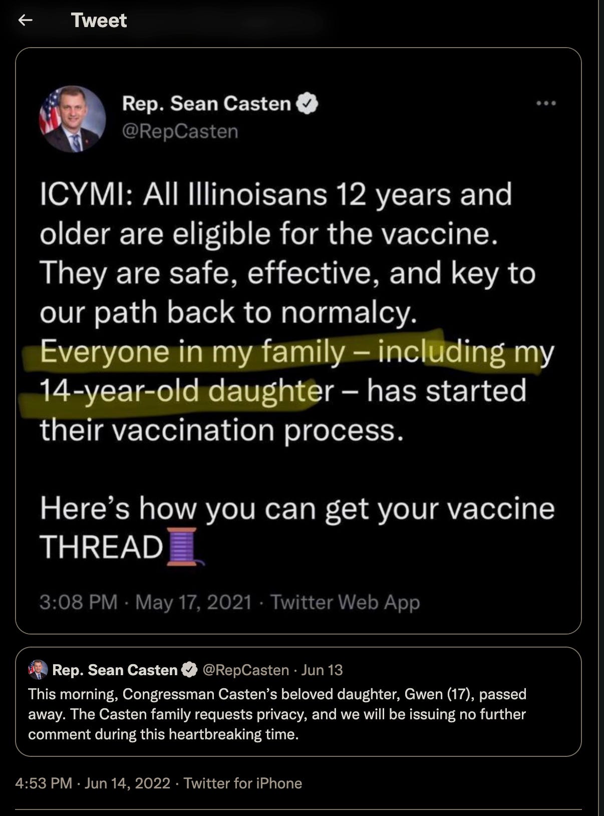 "The Casten family requests privacy . . . " He sure didn't care about privacy when he was demanding that health care workers get vaccinated.