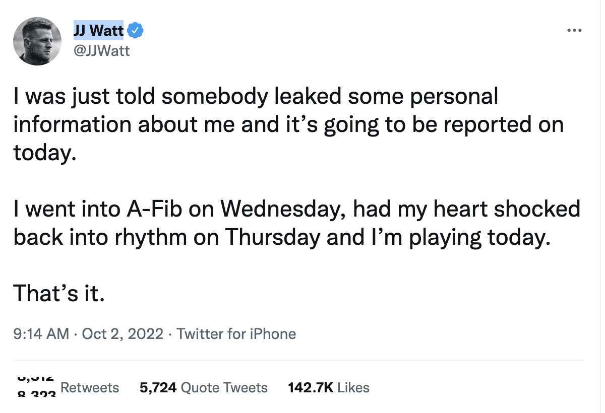 Despite having AFib, Watt was listed on the injury report as “questionable” for the game against the Panthers with a “calf injury.”