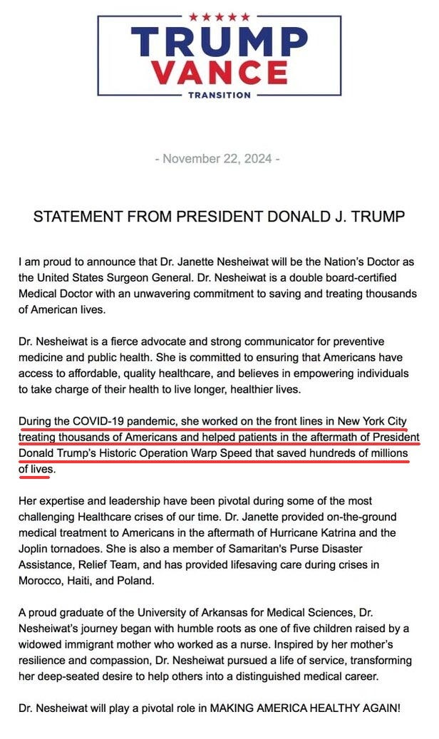 This is not to say that this Substack did not urge its readership to vote for Trump, because a series of articles were in fact written pleading with everyone to get Mister Operation Warp Speed back into office in 2025, but the trend here is profoundly worrying.