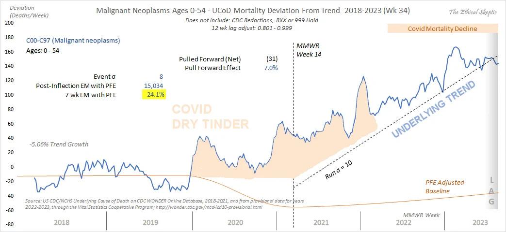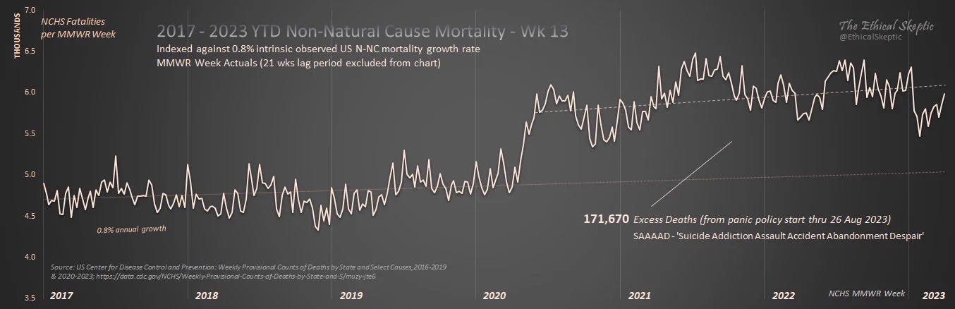 Yesterday this Substack reviewed the latest cardiac mortality data: A few days before that, this Substack reviewed the latest cancer data: Today we tie these terrifying trends together by reviewing the latest data on excess non-PSYOP-19 natural cause mortality:
