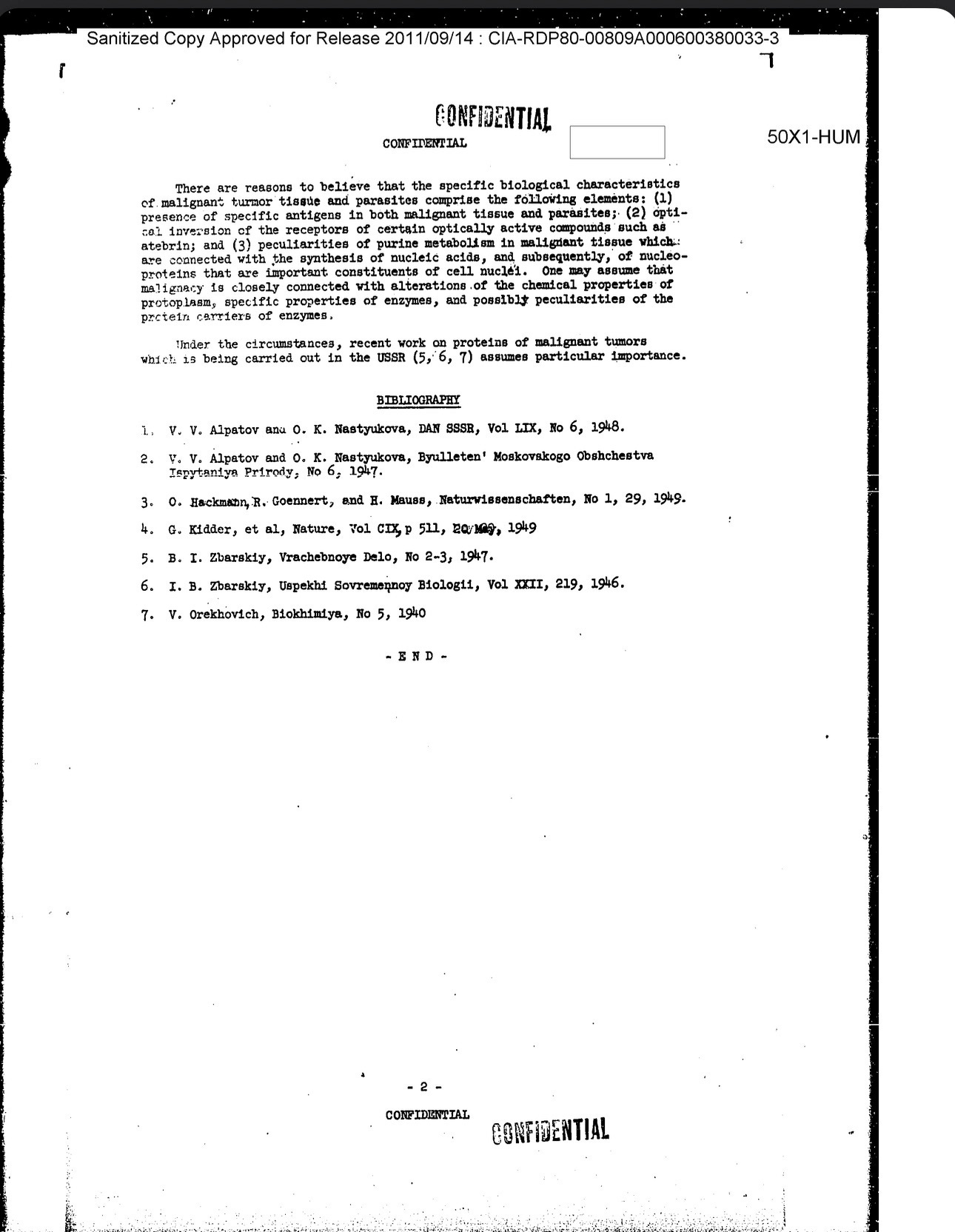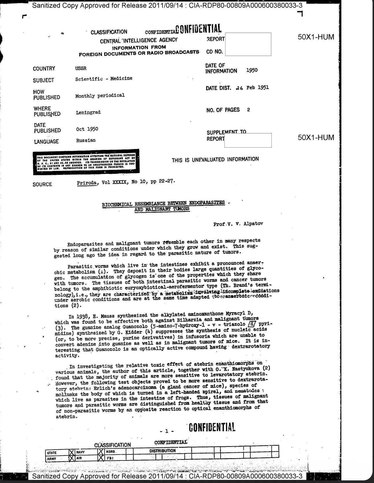 DECLASSIFIED CIA REPORT: BIOCHEMICAL RESEMBLANCE BETWEEN ENDOPARASITES AND MALIGNANT TUMORS