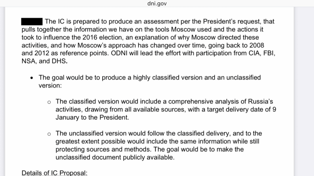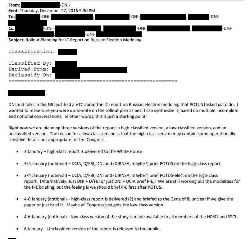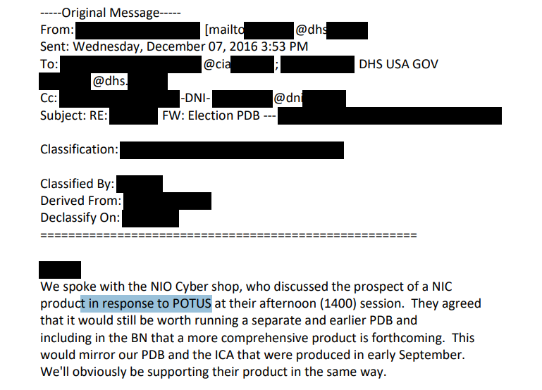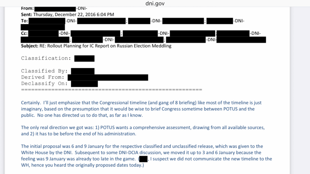 Another Dec. 22, 2016 email between top-level DNI officials concerns “the IC [intelligence community] report on Russian election meddling that POTUS tasked us to do.”