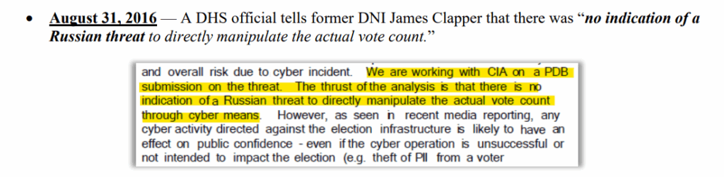 The memorandum gives a timeline showing that U.S. intelligence analysts, agencies, and reports leading up to the 2016 election had repeatedly concluded Russia couldn’t hack U.S. elections or change vote totals. Clapper received an intelligence analysis in August 2016 stating “there is no indication of a Russian threat to directly manipulate the actual vote count through cyber means.”