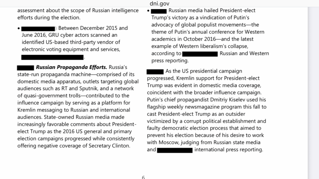 The doctored ICA itself crystalized and legitimized myriad politicized false claims that went on to hamstring the first Trump presidency. For example, it smeared rising pro-democracy movements across the West of citizens against international oligarchs as authoritarian by linking them with Vladimir Putin, claiming “Russian media hailed President-elect Trump’s victory as a vindication of Putin’s advocacy of global populist movements.”