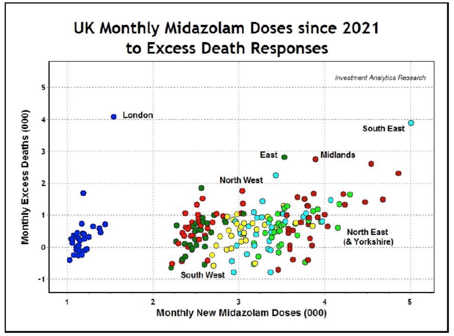 • The spikes in excess deaths across all regions were strongly correlated with Midazolam injections, implicating euthanasia, particularly of the elderly in care homes.
