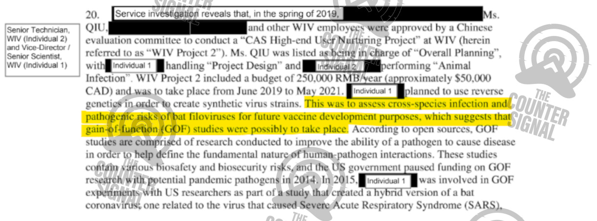 CSIS reported that “at least five virus strains from that March 31, 2019 BSL-4 pathogen shipment from [Winnipeg] to [Wuhan] were referenced in the Wuhan Institute of Virology Project 1.”