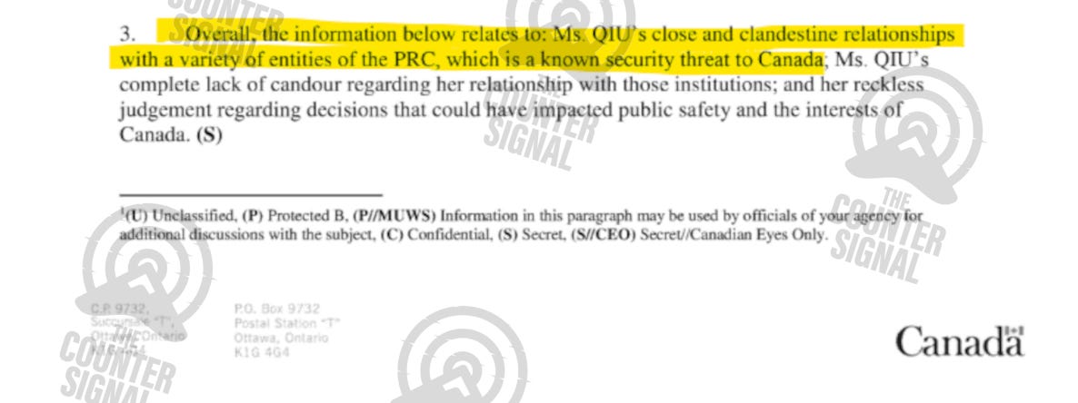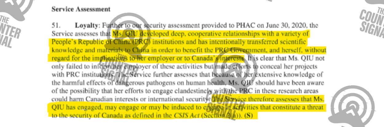 “Further to our security assessment […], the Service assesses that Ms. Qiu developed deep, cooperative relationships with a variety of People’s Republic of China (PRC) institutions and has intentionally transferred scientific knowledge and materials to China in order to benefit the PRC Government, and herself, without regard for the implications to her employer or to Canada’s interests.”