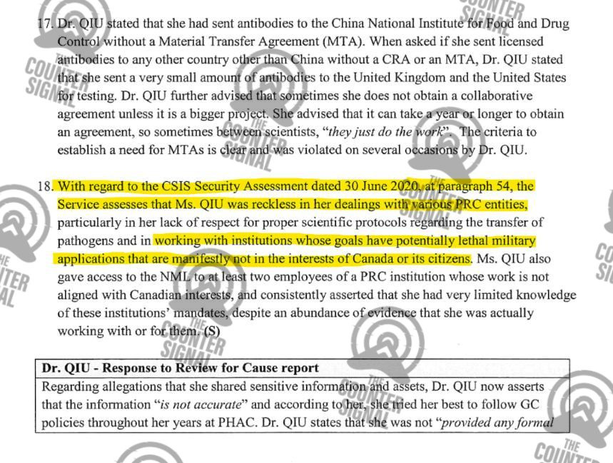 “The Service also assesses that Ms. Qiu was reckless in her dealings with various PRC entities, particularly in her lack of respect for proper scientific protocols regarding the transfer of pathogens and in working with institutions whose goals have potentially lethal military applications that are manifestly not in the interests of Canada or its citizens.”