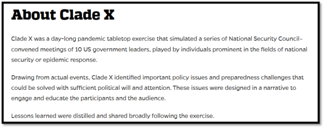 Adding that “faced with a rapidly evolving biological threat landscape, government leaders in the United States and abroad are eager to identify long-term policy commitments that will strengthen preparedness and mitigate risk.” Clade X is said to have “illustrated high-level strategic decisions and policies needed to prevent a severe pandemic or diminish its consequences should prevention fail.” and “will educate senior leaders at the highest level of the US government, as well as members of the global policy and preparedness community and the general public”