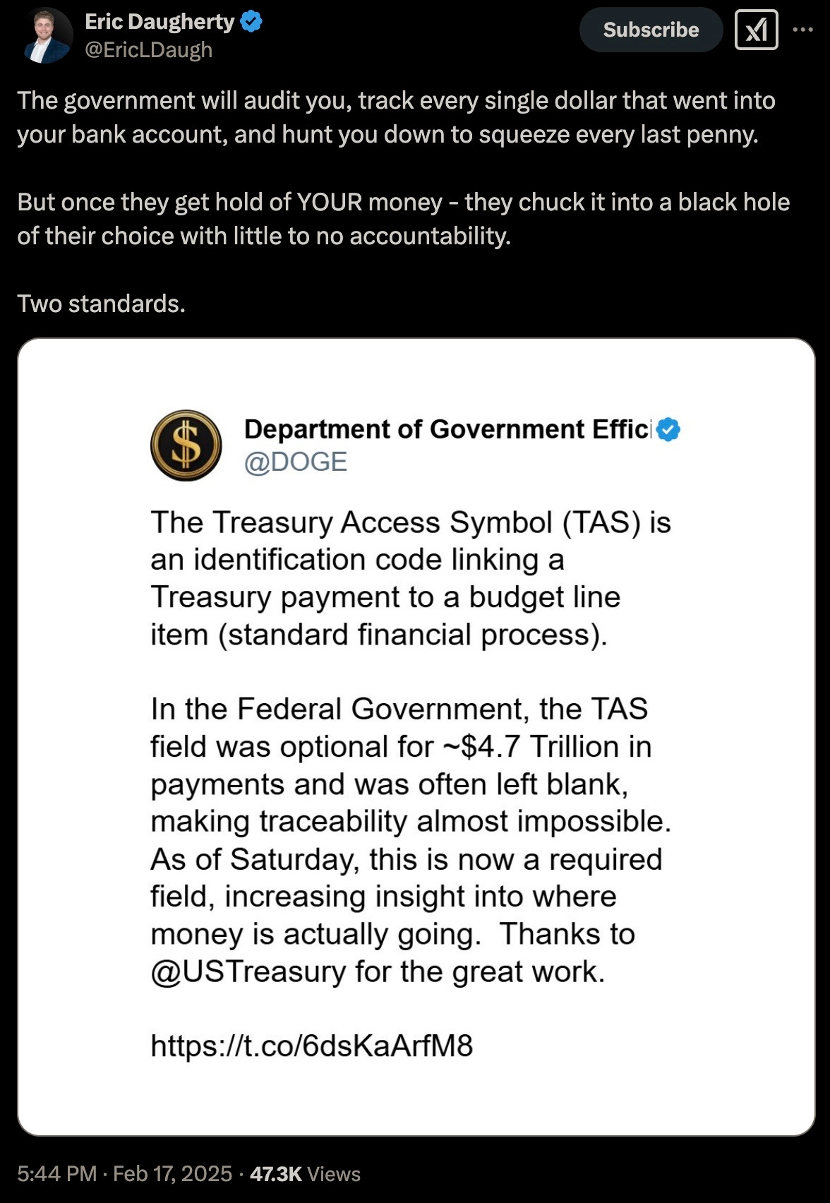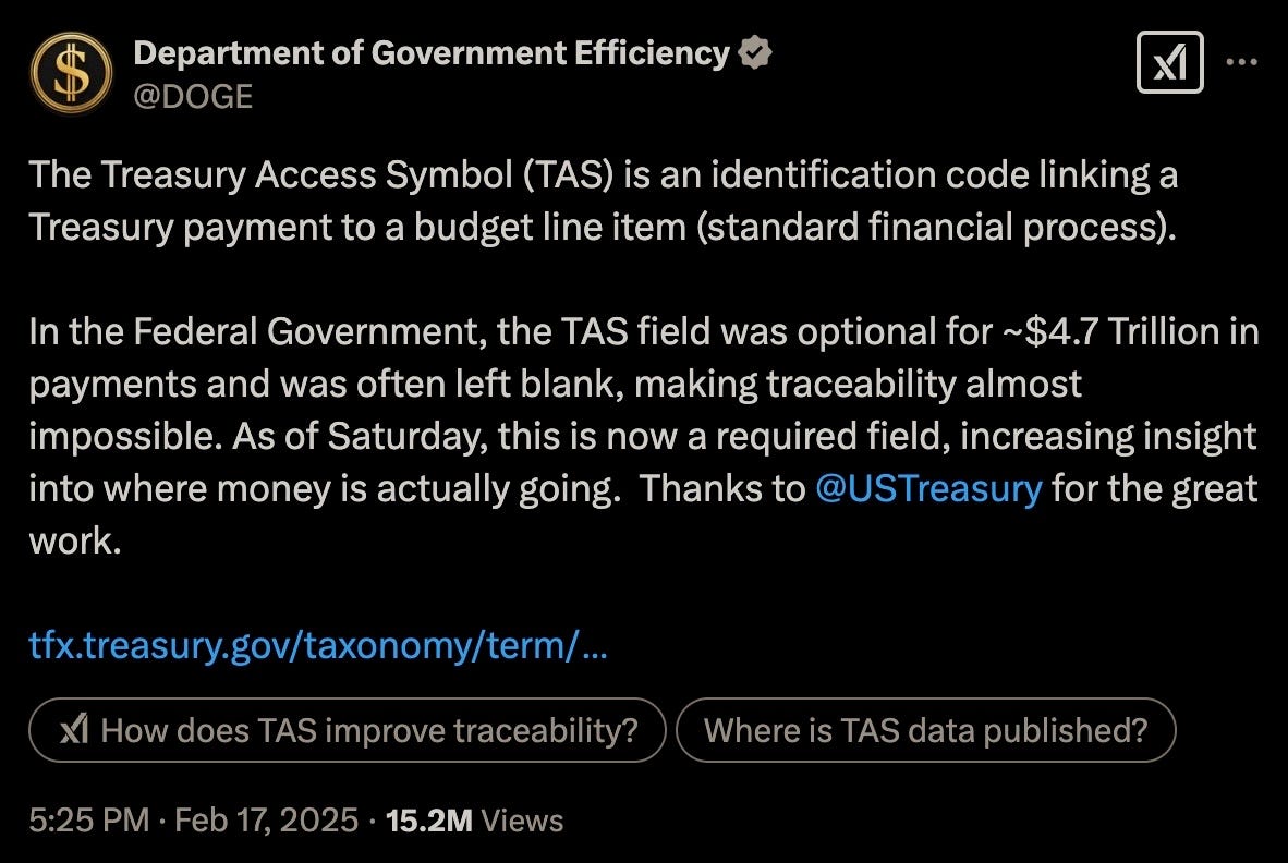 “The Treasury Access Symbol (TAS) is an identification code linking a Treasury payment to a budget line item (standard financial process),” The post explains, adding “In the Federal Government, the TAS field was optional for ~$4.7 Trillion in payments and was often left blank, making traceability almost impossible.”