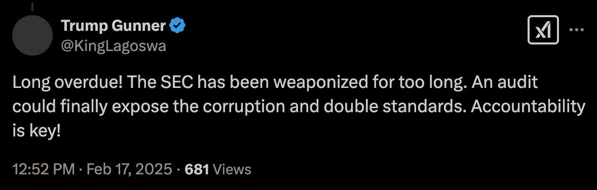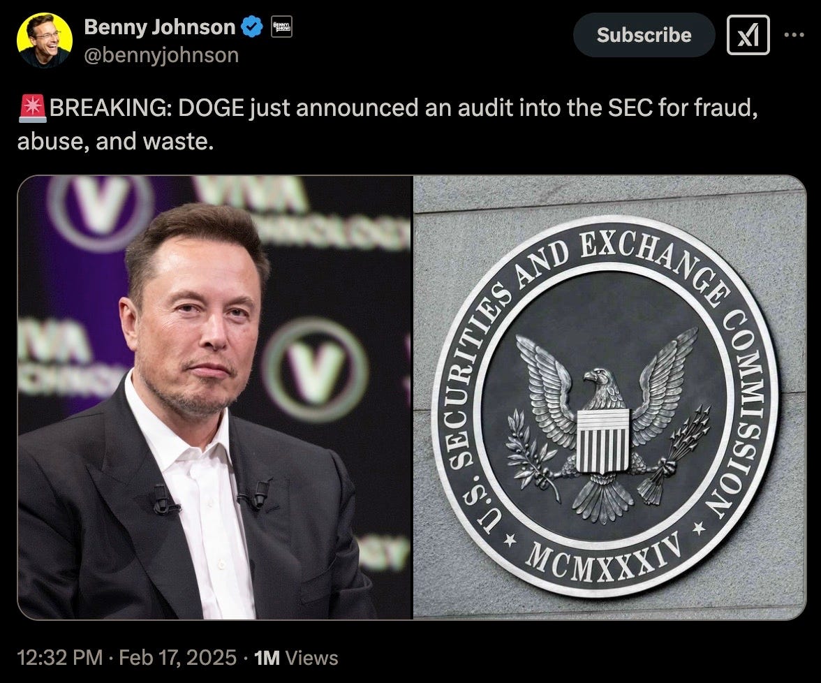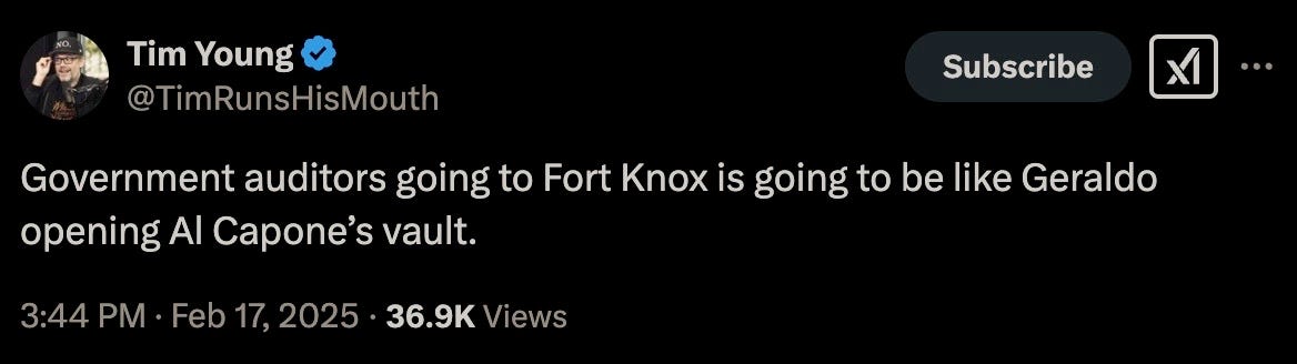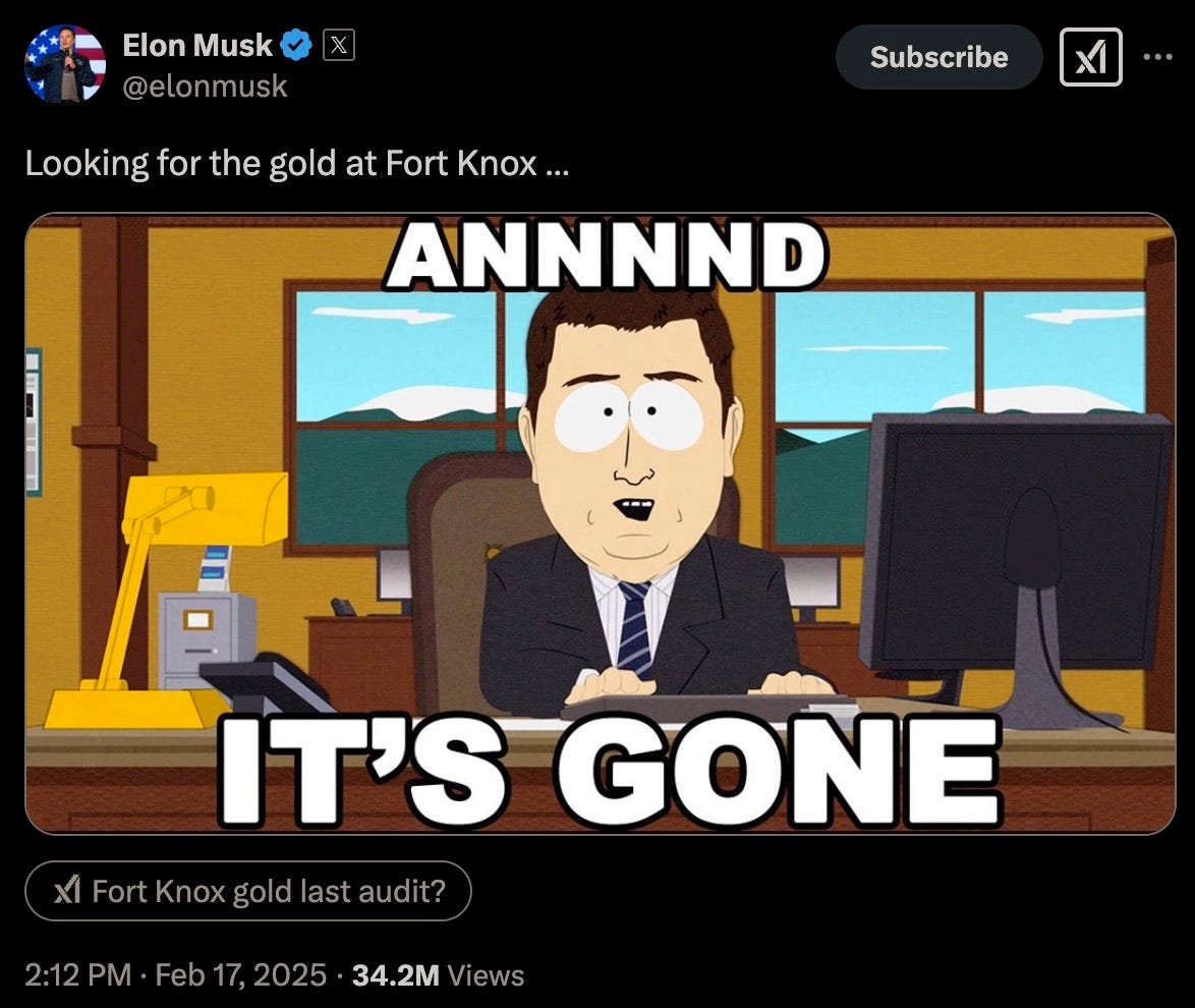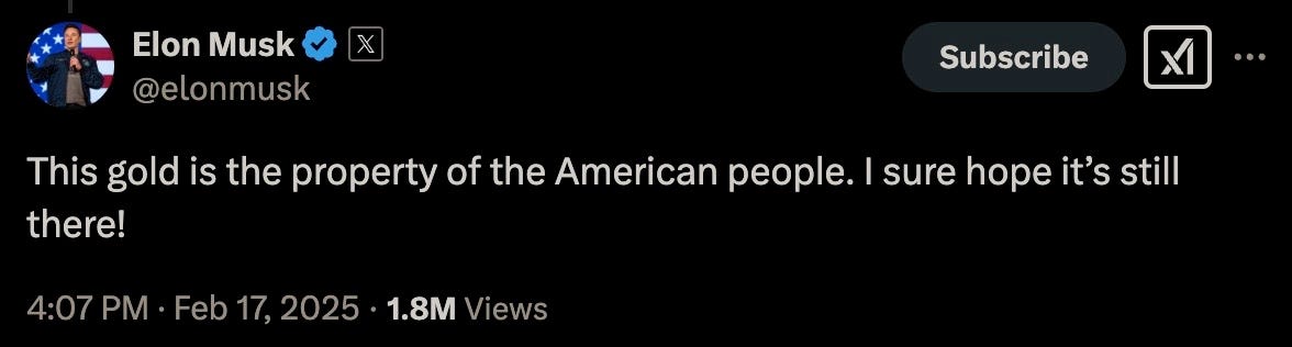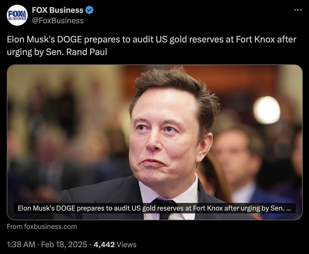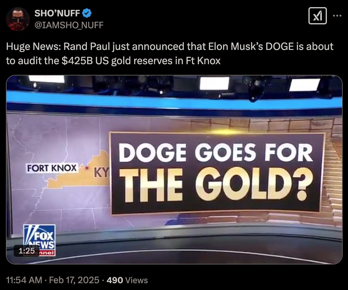 Musk has also stated that DOGE intends to literally try to get into Fort Knox and search for the over 4500 tons of gold that is supposed to be there.